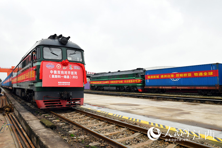 2月19日,2022年江西省首列中俄雙向對開班列(南昌—莫斯科)在南昌向塘國際陸港成功到發!皩﹂_班列”的開行將大大提高集裝箱周轉效率,降低企業運輸成本。 人民網 時雨攝