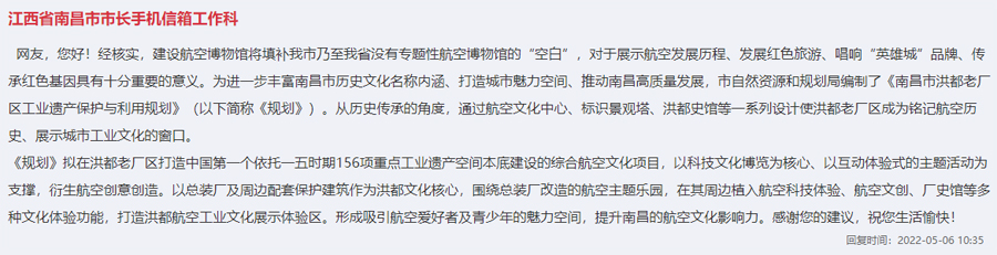 收到網友的建議后,南昌市市長手機信箱工作科對此表示肯定并積極回復。經核實,建設航空博物館將填補南昌市乃至江西省沒有專題性航空博物館的“空白”,對于展示航空發展歷程、發展紅色旅游、唱響“英雄城”品牌、傳承紅色基因具有十分重要的意義。