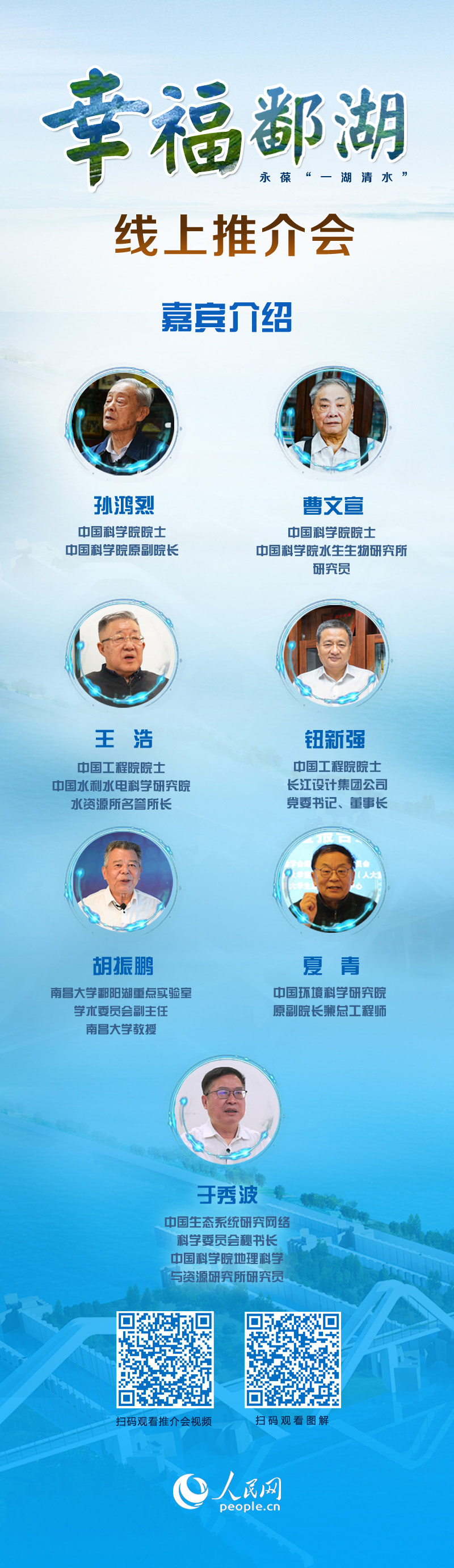 中國科學院院士、中國科學院原副院長孫鴻烈,中國科學院院士、中國科學院水生生物研究所研究員曹文宣,中國工程院院士、中國水利水電科學研究院水資源所名譽所長王浩,中國工程院院士、長江設計集團有限公司黨委書記、董事長鈕新強,南昌大學鄱陽湖重點實驗室學術委員會副主任、南昌大學教授胡振鵬,中國生態系統研究網絡科學委員會秘書長于秀波,中國環境科學研究院原副院長兼總工程師夏青等院士、專家通過視頻方式做客人民網,分享了鄱陽湖生態保護的新思維、新路徑。