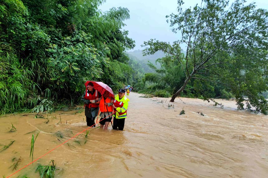 “大娘,別怕!我們一定把你和家人轉移到安全地方!泵窬贿叞参,一邊背起老人,旁邊的鎮干部撐起雨傘為老人擋雨。大雨滂沱,打在他們臉上,分不清是汗水還是雨水,直到把老人轉移至安全地帶,才顧得上用手擦一把。