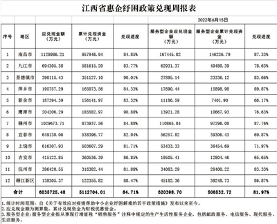實施增值稅大規模留抵退稅,是新的組合式稅費支持政策“重頭戲”,也是今年穩定宏觀經濟大盤的關鍵性舉措。6月16日,省政務服務辦公布了第八期惠企紓困政策兌現周報表。截至6月15日,全省累計兌現資金511.27億元,兌現進度84.71%;為服務型企業累計兌現資金50.85億元,兌現進度81.97%。