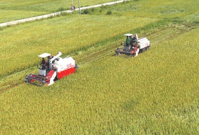 江西省撫州市東鄉區珀玕鄉蓮塘村,收割機在田間收割早稻。
