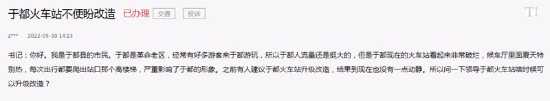 “江西省于都縣是著名的革命老區,經常有好多游客前來游玩,人流量很大,但是于都的火車站看起來很破爛,候車廳里夏天也特別熱,每次出行都要爬出站口那個高樓梯,嚴重影響了于都的形象?!苯?,網友通過人民網“領導留言板”給贛州市委書記留言,建議對于都火車站進行升級改造。