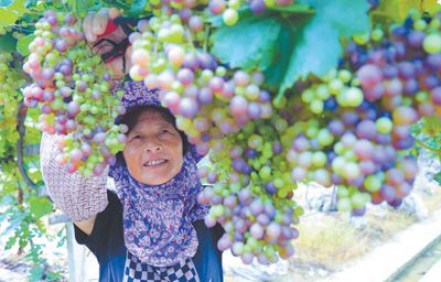 江西省湖口縣武山鎮長嶺村的果園里,農戶在為葡萄疏枝。