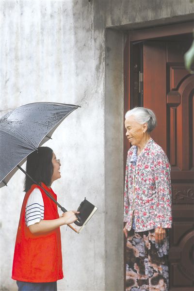 詹艷杰冒雨到空巢老人家探訪。朱 磊 陳旗海攝影報道