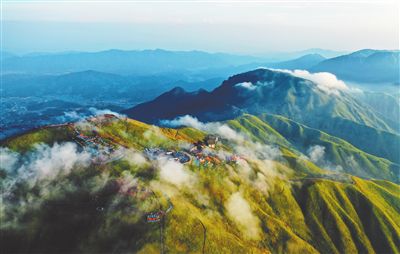 8月24日清晨,航拍鏡頭下的萍鄉武功山風景名勝區,山巔草甸綠意盎然,云霧繚繞猶如仙境。該景區以獨特的自然風光,吸引眾多游客慕名前來避暑度假。本報記者 洪子波攝