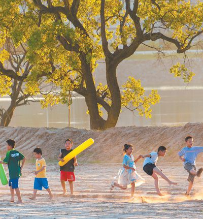 江西吉安新干縣荷浦鄉莒洲島沙灘露營地,孩子們在玩耍。