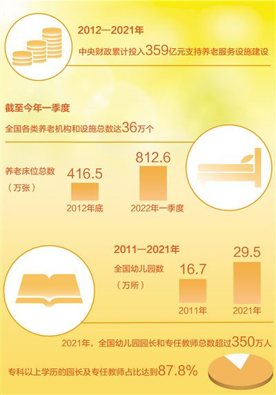 黨的十八大以來,我國積極推動養老托育服務健康發展。2012—2021年,中央財政累計投入359億元支持養老服務設施建設;截至今年一季度,全國各類養老機構和設施總數達36萬個、床位812.6萬張,養老床位總數比2012年底的416.5萬張翻了近一番。10年來,學前教育資源總量迅速增加,2021年全國幼兒園數達到29.5萬所,比2011年增加12.8萬所,增長了76.8%;2021年全國幼兒園園長和專任教師總數超過350萬人,??埔陨蠈W歷的園長及專任教師占比達到87.8%。