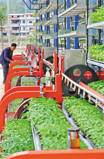 江西省贛州市于都縣一家數字智慧育秧中心,工作人員在打理立體循環運動式育苗架上培育的蔬菜苗。朱海鵬攝(人民視覺)