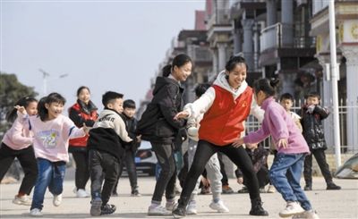 江西省宜春市袁州區蘆村鎮的黨員志愿者在和孩子們快樂地做游戲。周 亮攝(影像中國)