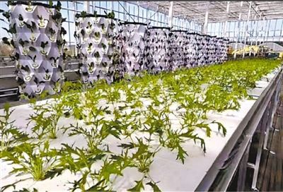 在試驗區大棚里參觀體驗的初中生李星安看到了一番奇妙光景:大棚中蔬菜生產槽整齊排布,槽中的水暗暗流動,水上漂浮著一片片帶孔的泡沫板,孔中栽植著生菜、京水菜、紫包菜、冰菜等多種蔬菜。另外一邊的藍色養殖桶上,成簇的水花翻騰,密密麻麻的魚兒在水中游弋。