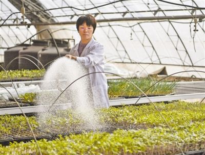 天津市農業科學院創新基地大棚內,研究員金鳳媚在進行農作物試驗品種的管護工作。