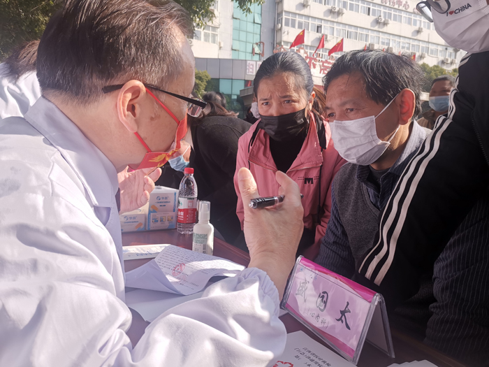 相對于安靜的門診,廣場上的義診環境嘈雜,和病人溝通起來比較吃力,但是盛國太依然耐心十足。
