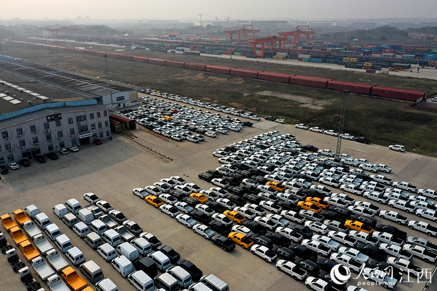 ?南昌國際陸港內等待裝上外貿班列的汽車整車。人民網 時雨攝