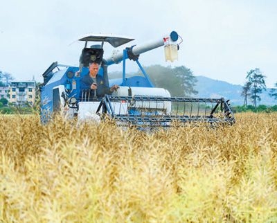 江西省寧都縣會同鄉的油菜進入成熟期,農機手駕駛收割機在收割油菜。朱海鵬攝(人民視覺)