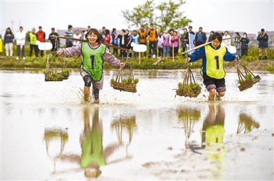 近日,江西省樟樹市洲上鄉春季農耕趣味運動會開幕,來自當地21個村委(社區)的200余名選手參加了稻田插秧、獨輪車運糧、搶運冬瓜等項目比賽。圖為參賽選手在運動會上進行運秧比賽。