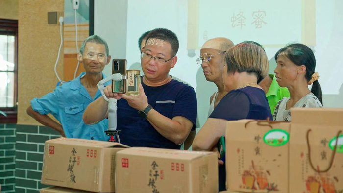 汪亮(中)正在和村民一起直播。受訪者供圖