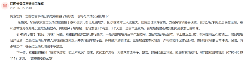 收到網友留言后,江西省委民聲通道工作室在回復中稱,經核實,該網友反映放置垃圾桶的位置位于泰和縣東門公證處圍墻外,因該區域附近人流量大、居民居住較為密集,為避免垃圾亂丟現象,在充分征求周邊居民意見后,泰和縣城管局在此處設置垃圾投放點,共放置4個垃圾桶,現場發現2個有蓋、2個無蓋,當前氣溫較高,在垃圾桶附近確實能聞到散發出的異味。