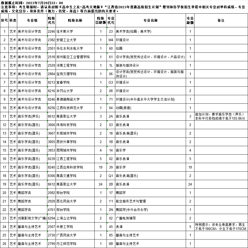 江西省2023年普通高校招生藝術本科平行志愿缺額院校及專業統計表
