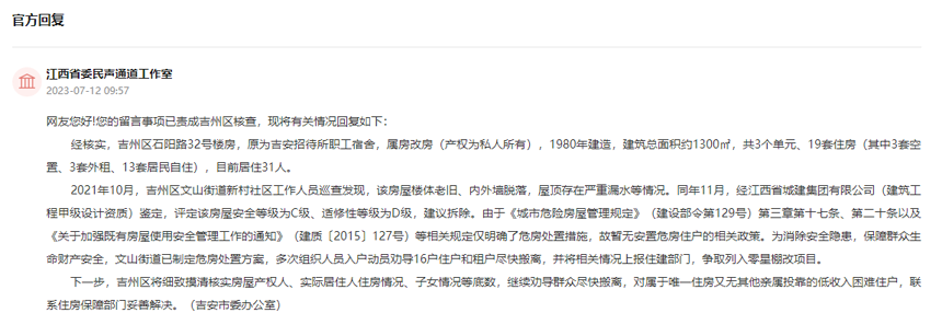 江西省吉安市委辦公室回復稱,經核實,吉州區石陽路32號樓房,原為吉安招待所職工宿舍,屬房改房(產權為私人所有),1980年建造,建筑總面積約1300㎡,共3個單元、19套住房(其中3套空置、3套外租、13套居民自?。?,目前居住31人。