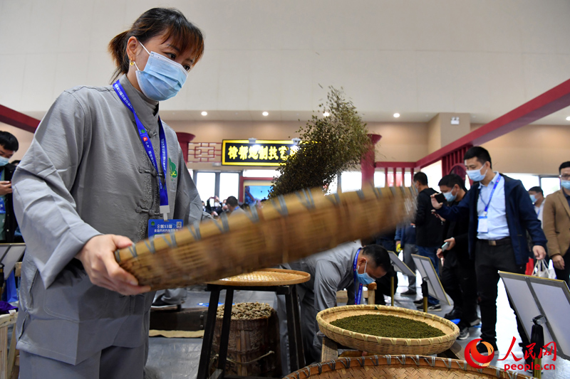 在樟樹岐黃小鎮里,藥工正在進行樟幫中藥炮制技藝展演。 人民網記者 時雨攝
