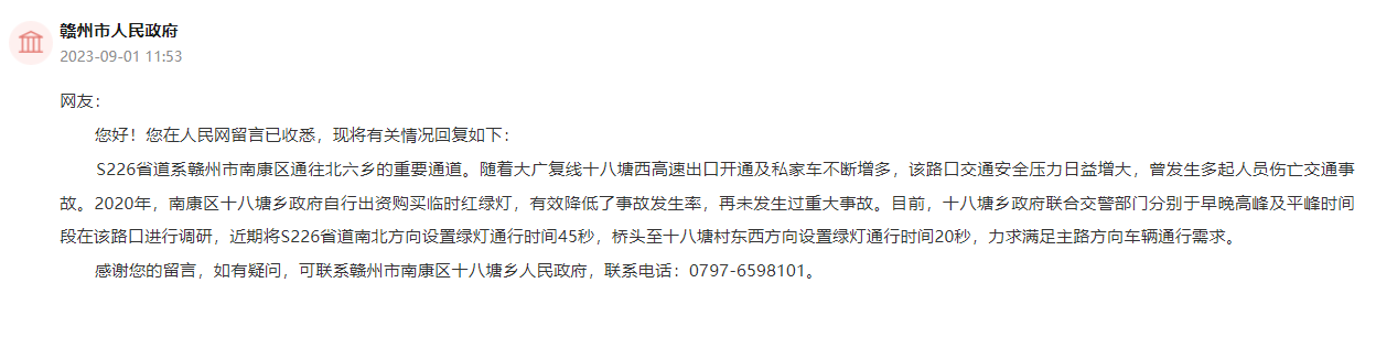 贛州市人民政府回復中表示,S226省道系贛州市南康區通往北六鄉的重要通道。隨著大廣復線十八塘西高速出口開通及私家車不斷增多,該路口交通安全壓力日益增大,曾發生多起人員傷亡交通事故。2020年,南康區十八塘鄉政府自行出資購買臨時紅綠燈,有效降低了事故發生率,再未發生過重大事故。