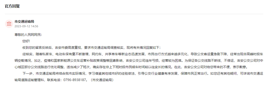 為保證各公交線路不斷線、不停運,吉安公交公司對中心城區部分公交線路進行優化調整,適當減少了班次,確實存在非上下班時段市民候車時間較以往變長的情況。