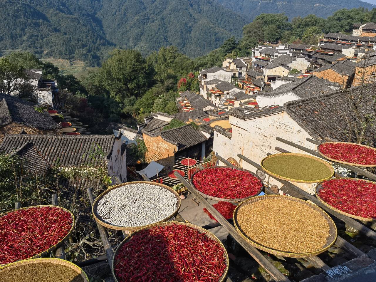 在距篁嶺30公里外的婺源縣秋口鎮王村石門自然村,村民也在曬場和自家房前屋后、窗臺屋頂架曬或掛曬農作物,層疊的曬匾如同調色盤,與灰瓦白墻的徽派建筑相映成趣。