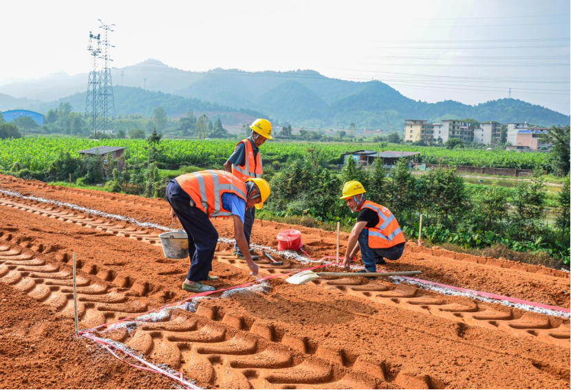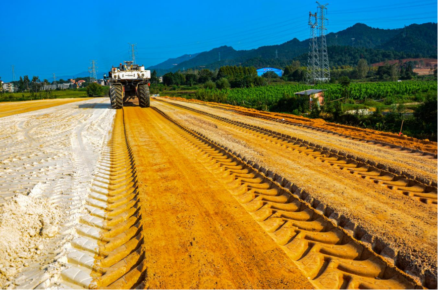 以往,長石粉主要用作陶瓷、玻璃等建材原料,但消耗量有限。經研究調查得知,長石粉硬度和耐摩擦性很高,具有一定的粒度,混入路基結構中,優化路基土顆粒級配組成,大幅度提升路基的整體穩定性,在減排節能的基礎上,大幅度提升路基質量,提高公路工程耐久性。通過積極策劃、科學部署,近日,本項目首段復合長石粉路基試驗段順利完成鋪筑。項目各級人員嚴格落實施工技術及安全交底,在試驗段填筑過程中按照“三階段、四區段、八流程”的施工工藝組織施工,嚴格把控備料、拌合、運輸、攤鋪、壓實和檢測等每個施工環節,做到銜接有序,保證試驗段的平整度、厚度、壓實度、寬度、縱斷高程、橫坡等各項指標均符合規范要求。