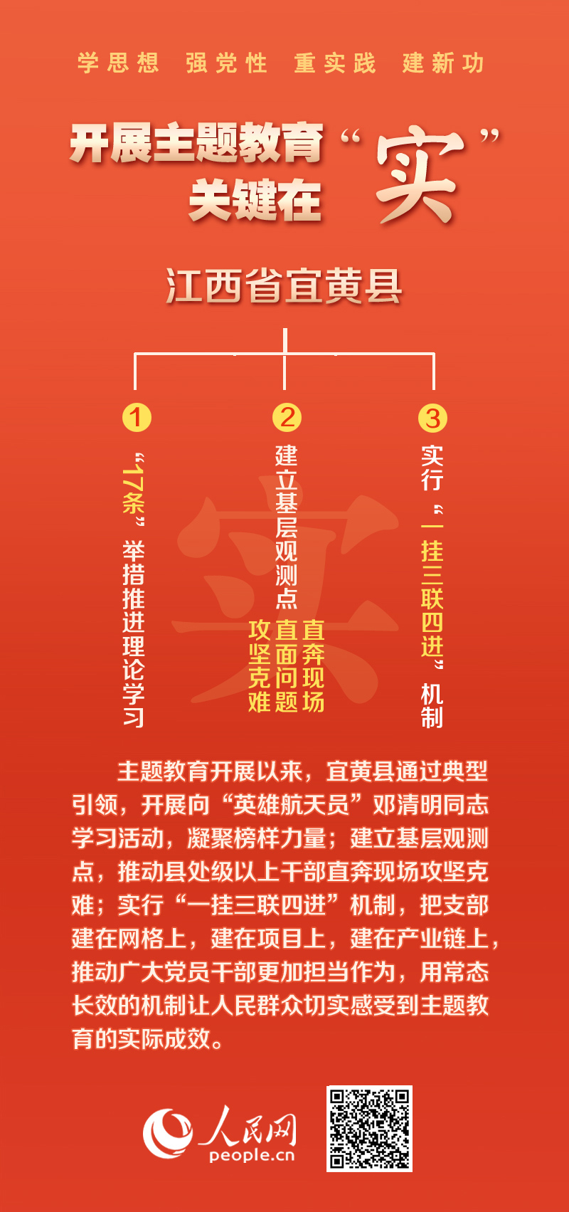 宜黃縣強化對主題教育的精準指導,在全縣484個基層黨組織中建立52個基層觀測點,安排26名縣級領導掛點聯系,實行“三報送兩會診一試點”工作機制,推動主題教育走深走實。