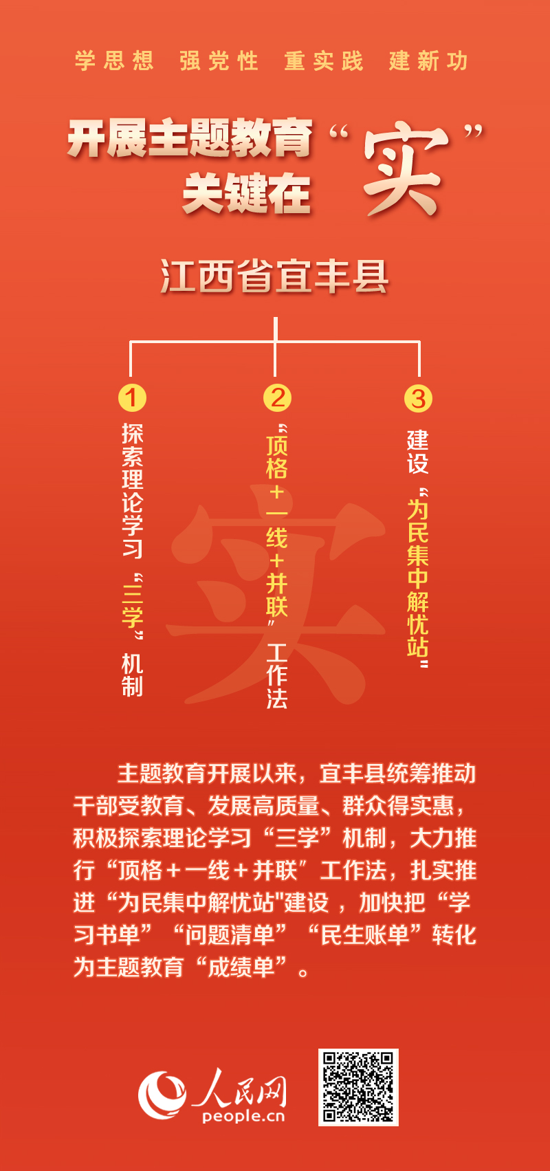 “開展主題教育關鍵在實?!币素S縣委書記康健表示,宜豐縣把“五個更加注重”和三個“實實在在”作為第二批主題教育的重要要求,凝心鑄魂筑牢根本,真抓實干推動發展,務求實效取信于民,加快把“學習書單”“問題清單”“民生賬單”轉化為主題教育“成績單”。