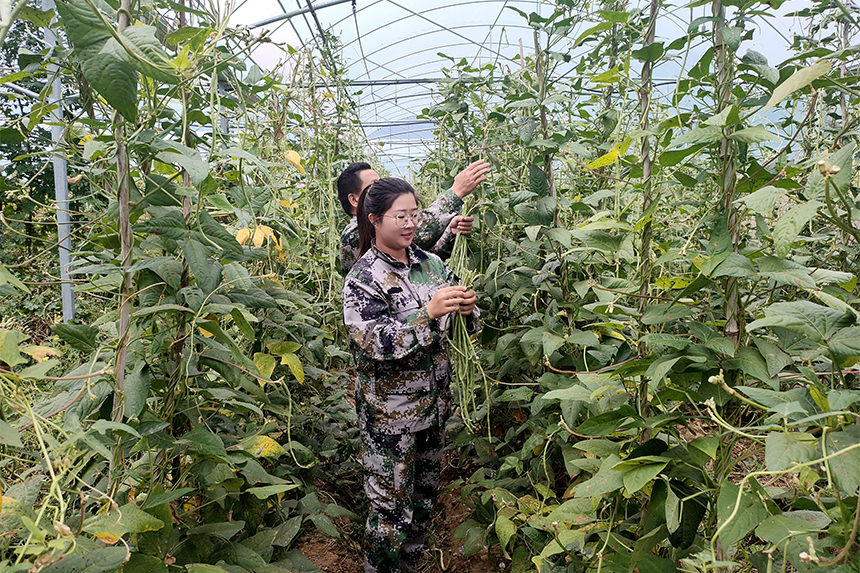 肖玉與農戶一起在采摘蔬菜。