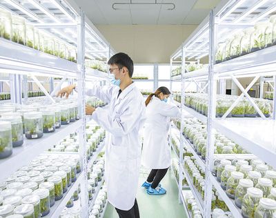 圖為中國中醫科學院中藥資源中心(德興)試驗培訓基地內,中藥專家(前)與工作人員整理藥用植物培養皿。