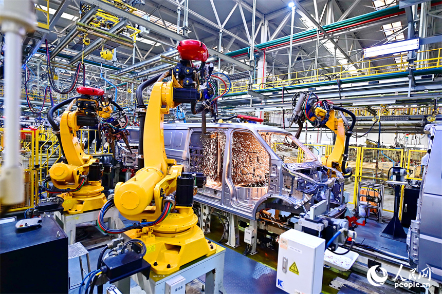 2月18日,江西省贛州經開區的一家新能源汽車制造公司車間內,生產線上的智能機器人快速運轉,工人忙著組裝出口的新能源電動箱式汽車。人民網 朱海鵬攝