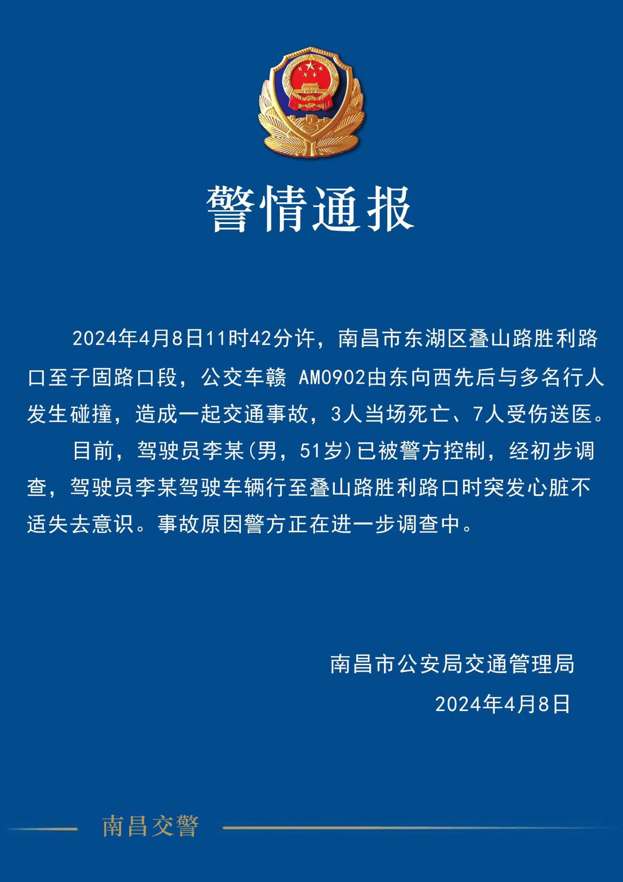 人民網南昌4月8日電(記者時雨)8日,南昌市公安局交通管理局發布警情通報:2024年4月8日11時42分,南昌市東湖區疊山路勝利路口至子固路口段,公交車贛AM0902由東向西先后與多名行人發生碰撞,造成一起交通事故,3人當場死亡、7人受傷送醫。