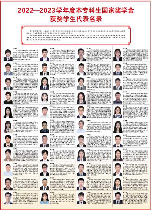 經過嚴格選拔和評審,全國6萬名本??茖W生榮獲2022—2023學年度國家獎學金。以下100名學生,是本??粕鷩要剬W金獲獎學生中的優秀代表。希望廣大青年學生從榜樣中汲取成長力量,樹立報國理想,矢志愛國奮斗,努力成長為堪當民族復興重任的時代新人,讓青春之花在全面建設社會主義現代化國家的火熱實踐中絢麗綻放。
