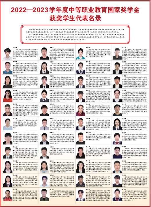 經過嚴格選拔和評審,全國約2萬名中職學生榮獲2022—2023學年度中等職業教育國家獎學金。以下100名學生,是中等職業教育國家獎學金獲獎學生中的優秀代表。希望全國中等職業學校學生以他們為榜樣,把個人理想追求融入黨和國家事業之中,志存高遠、腳踏實地,以匠心筑夢,以技能修身,練就過硬本領,不負時代使命,努力將自己鍛造成為新時代的大國工匠。