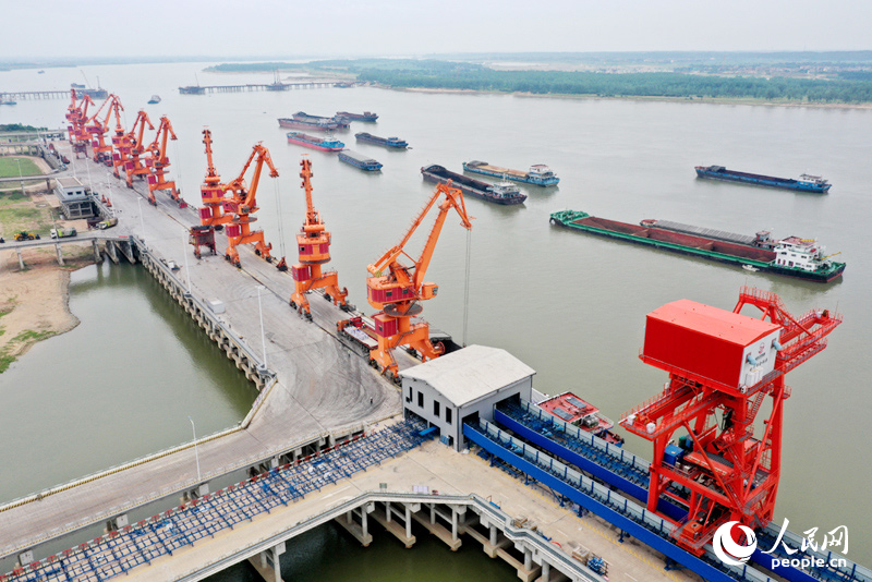 航拍鏡頭下的姚灣綜合碼頭。該碼頭是全國一次性批復泊位最多、岸線最長的內河港口碼頭,為南昌腹地經濟發展提供重要支撐,有效助推長江經濟帶高質量發展。人民網記者 時雨攝