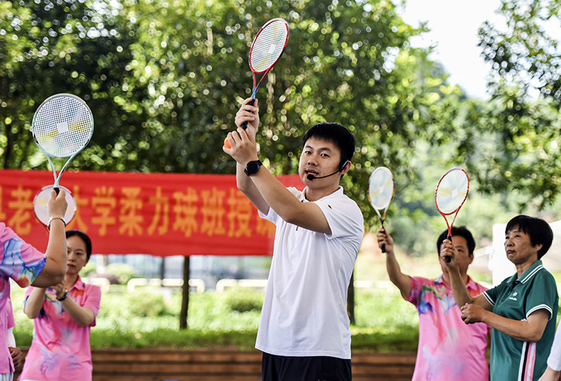 2024年5月30日,在江西省撫州市資溪縣老年大學活動中心,國家一級柔力球教練員、一級裁判員金偉明為學員傳授柔力球動作要領。太極柔力球是近年來受到群眾喜愛的一項的體育運動項目,金偉明手把手耐心糾正規范柔力球愛好者基礎套路技巧。(吳志貴攝影報道)