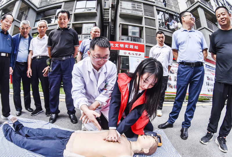近日,在江西省撫州市資溪縣司前社區,醫護工作者指導居民學習心肺復蘇技能。江西省人民醫院資溪醫院胸痛中心組織醫療專家走進各社區,開展以“關愛生命 救在身邊”為主題的科普、心肺復蘇技能培訓和義診活動,提升群眾心臟急救意識,提高院外心臟驟停救治成功率,改善全縣心臟急救整體狀況,實現自救與互救雙贏。(吳志貴攝影報道)