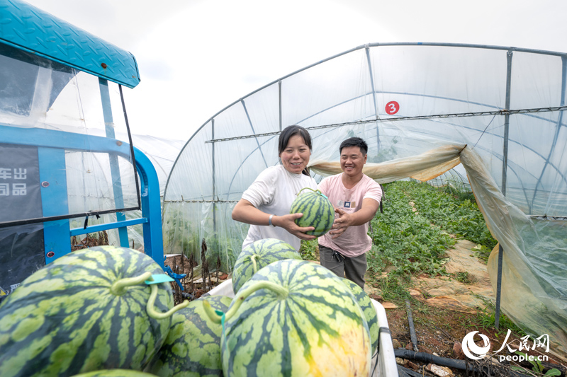 目前,大棚內的西瓜迎來成熟季,周玉成和易飛忙碌著將西瓜上市。人民網記者 時雨攝