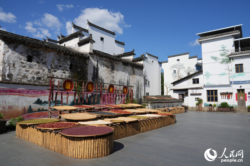 村內廣場上,一排排曬盤盛滿農作物,格外喜人。人民網 孔文進攝