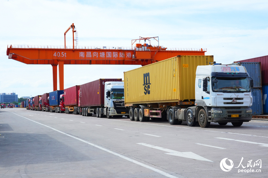 南昌國際陸港貨場,集裝箱運輸車正在排隊等待卸貨。人民網記者 毛思遠攝