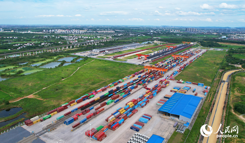 人民網南昌7月20日電 (記者毛思遠)近日,位于江西省南昌市南昌縣的南昌國際陸港貨場,貨運班列、集裝箱運輸車裝卸繁忙,準備出口汽車和各種貨柜整齊排列。