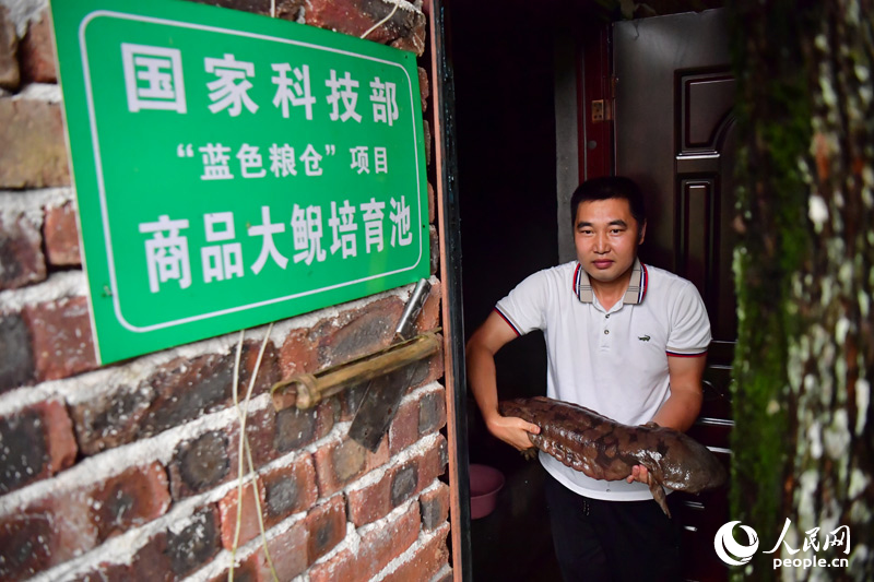 養殖戶楊志平展示他養殖的商品大鯢。人民網記者 時雨攝