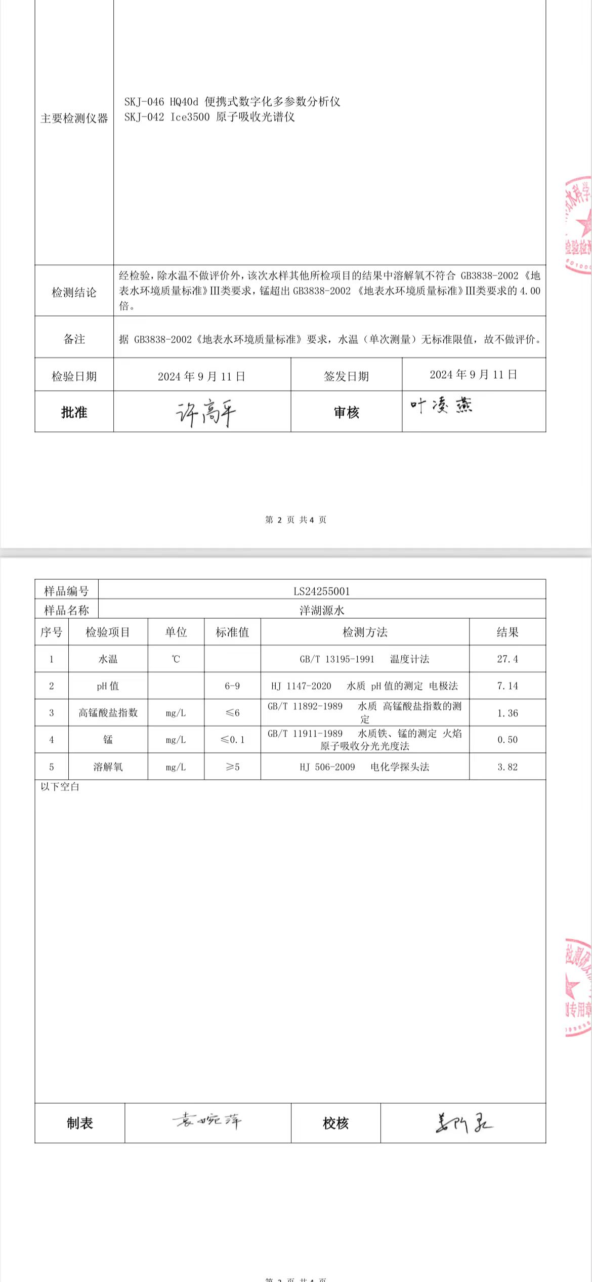 連日來,網絡上流傳的9月11日洋湖源水水質報告,檢測結論為:經檢驗,除水溫不作評價外,該次水樣其他所檢項目的結果中溶解氧不符合GB3838-2002《地表水環境質量標準》Ⅲ類要求,錳超出GB3838-2002《地表水環境質量標準》Ⅲ類要求的4.00倍。