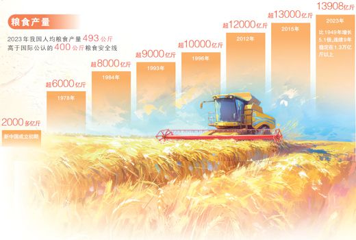 豐收成色十足?!安丶Z于地、藏糧于技”戰略深入實施,我國糧食綜合生產能力穩步提升,連續9年穩定在1.3萬億斤以上。截至2023年,全國綠色、有機、名特優新和地理標志農產品認證登記總數達到7.5萬個。蔬菜水果品種琳瑯滿目,居民的“菜籃子”“果盤子”更加豐富。