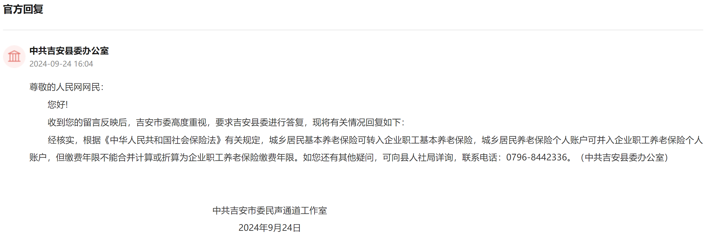 吉安縣委辦公室回復稱:根據《中華人民共和國社會保險法》有關規定,城鄉居民基本養老保險可轉入企業職工基本養老保險,城鄉居民養老保險個人賬戶可并入企業職工養老保險個人賬戶,但繳費年限不能合并計算或折算為企業職工養老保險繳費年限。
