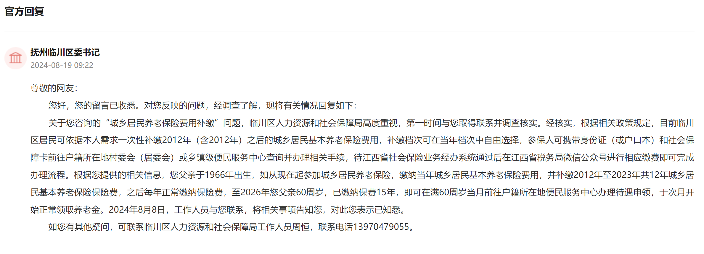 “我父親是撫州臨川區農村戶口,1966年出生,之前沒有交過職工社保和參加城鄉居民養老,現在能否參加城鄉居民養老,然后正常繳費到60歲,60歲以后一次性補繳養老保險并領取退休金呢?”近日,網友向撫州市臨川區委書記留言。【留言地址】