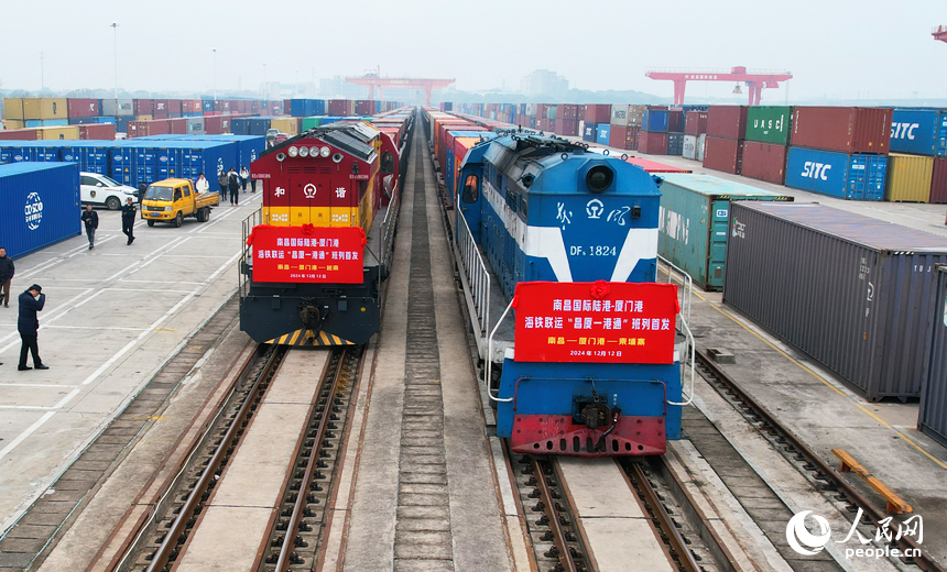 人民網南昌12月12日電 (記者毛思遠)12月12日上午,伴隨著汽笛長鳴,兩列滿載著“江西制造”的鐵海聯運班列,在贛江新區海關的監管下依次駛出南昌國際陸港,標志著南昌國際陸港至廈門港“昌廈一港通”鐵海聯運班列正式開行,有力助推江西現代物流體系建設邁上新臺階。